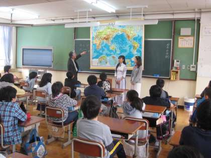 国際交流として来日されている2名のベトナムの学生の方から,ベトナムの文化や様子についていろいろと教えていただきました。ベトナム国歌や御室小学校校歌など歌の交流も行いました。