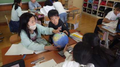社会科では国土の地形など、地理的な学習をしています。地球儀も興味深々で観察していました。