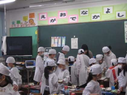 12日から給食が始まりました。それに合わせて6年生は,1年生に給食当番のお仕事を教えに行っています。