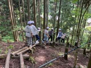 楽しみにしていたアスレチックを、「キャー」、「楽しいー」など、感情あふれる体験をしています。