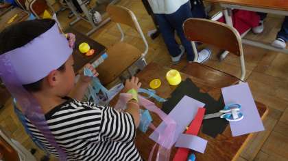 今週の図画工作科では、わっかを使ってなりたいものに変身する学習を行いました。