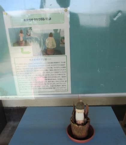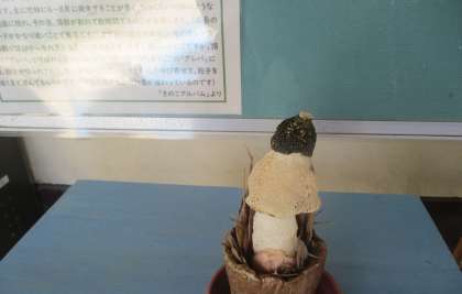 御室小学校の校区で見つかったキヌガサタケを,地域の方が持ってきてくださいました。美しいフリルのようなひだを広げる姿は、キノコの女王と呼ばれています。みんなで観察しました。