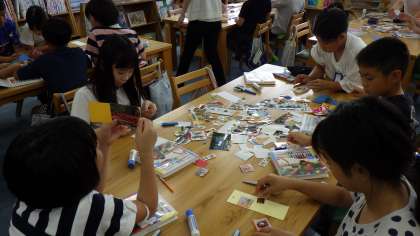 好きな絵を選んで貼ったり、絵や文字などをかいたりしてオリジナルのしおりを作りました。