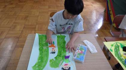 図画工作の学習で3組の畑で収穫したきゅうりの絵を描きました。筆で大きなきゅうりを、パスで収穫している自分たちを描きました。大きく育ったきゅうりが画用紙いっぱいにのびのびと描かれていて、楽しい作品に仕上がりました。