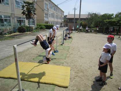 何回も積極的に,子ども達はいろいろな技に取り組み,「やった。できた。」「おしい。もう少し。」などと声を出し合い,素敵な場面がたくさん見られます。