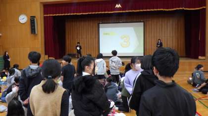 双ケ丘中学校へ半日入学に行きました。4校の6年生が集まるということで、出発前からどきどきしていた子どもたちでしたが、生徒会の皆さんにクイズを出してもらったり、部活の紹介を聞いたりとリラックスした様子で参加することができました。