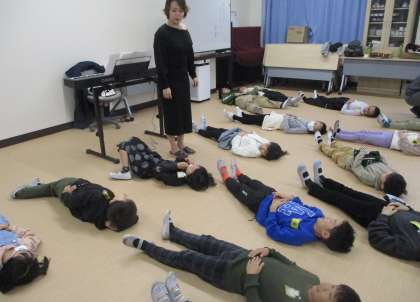 音楽科の学習で講師をお招きし、歌うときの息の使い方や表現のしかたについて教えていただきました。息の使い方では床に寝ころび、お腹が膨らんだりへこんだりしているのを確認しました。表現の学習では、うれしいカエルや悲しいカエルになりきって動いてみたり歌い方を変えたりして活動に取り組んでいました。