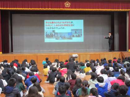 校歌を歌った後、学校教育目標と児童会目標の確認をし、「いつもの学校生活で、みんなが楽しく幸せに過ごすためには、どうしたらよいのだろう。」「どのような姿が楽しく幸せな学校生活につながるのだろう。」と問われました。