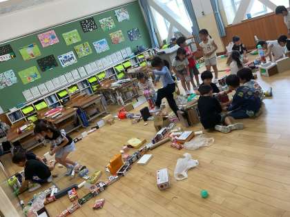 6月4日、図画工作科の学習でいろんな空き箱や容器を重ねたり、繋げたりして建物や道や線路などを作りました。それぞれが作ったものをつなげて最後は大きな街がつくりました。「高いビルだ。」「広い街ができた。」「橋ができたよ。」など声をかけあって素敵な作品ができました。今回もご家庭から空き箱や容器の準備のご協力をいただき、ありがとうございました。
