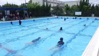 5年生の水泳学習が始まりました。天候に恵まれ、気持ちのよいスタートがきれました。子どもたちは自分の泳げる泳法で25m泳いでいました。