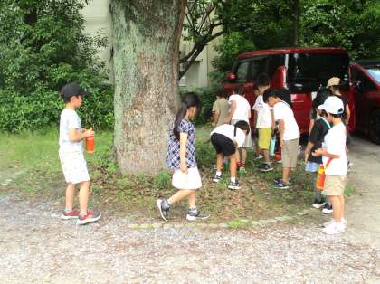 生活科で「生きものと友だち」の学習をしました。これまでの経験を交流してみると「中庭でバッタを見たよ!」「石段にダンゴムシがいたよ!」とたくさん声があがり、学校にいろいろな生きものがいることが分かったので、早速みんなで見に行ってみました。中庭やビオトープ、運動場や門の近くでたくさんの生きものを見つけました。教室で「生きものと友だちになるにはどうしたらいいか」を考えました。「飼ってみたい!」「教室で一緒に過ごしたい!」という案が出ました。