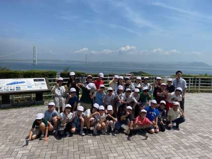 淡路サービスエリアに、無事到着しました。素晴らしい景色を背にして、集合写真をとりました。