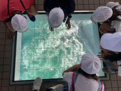 床の一部がガラス張りになっており、そこからのぞいて、興味津々で見ていました。このあと、旅館に向かいました。