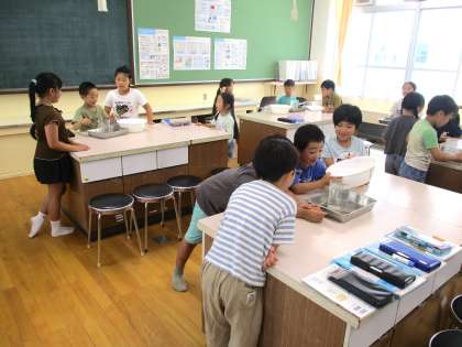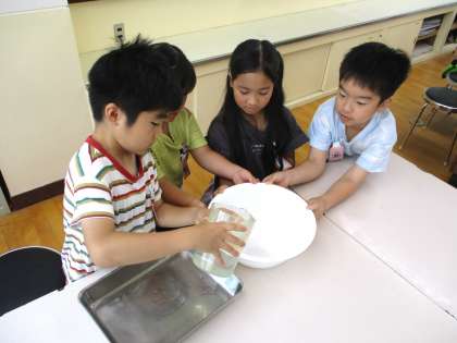 算数科で「かさ」の学習が始まりました。ますに水を入れたり、入れものに入っている水が何リットルかをはかったりするために、家庭科室で授業を行っています。