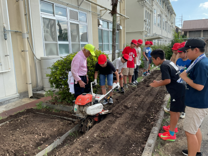 土づくりの際は油粕を肥料にしてまきました。また、トラクターを使用して、土をみんなで協力し、混ぜ合わせました。
