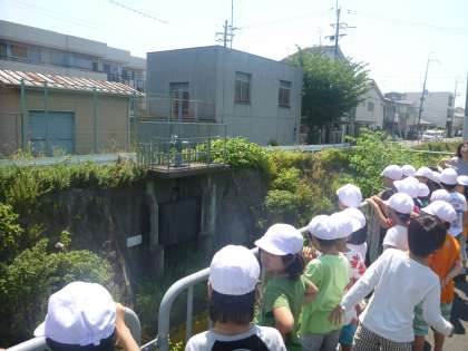 最後は,新丸太町通りを越えて,雨水下水(道路の側溝に流れ込んだ雨水が流れていく下水)が川に合流する水門を見てから帰りました。
