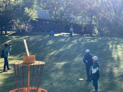 グループごとに、フリスビーをゴールめがけて、投げています。