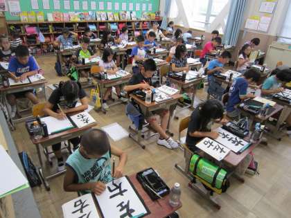 習字の時間はみんな,集中して書いています。今回の文字は,「左右」で,どちらののクラスも書きました。