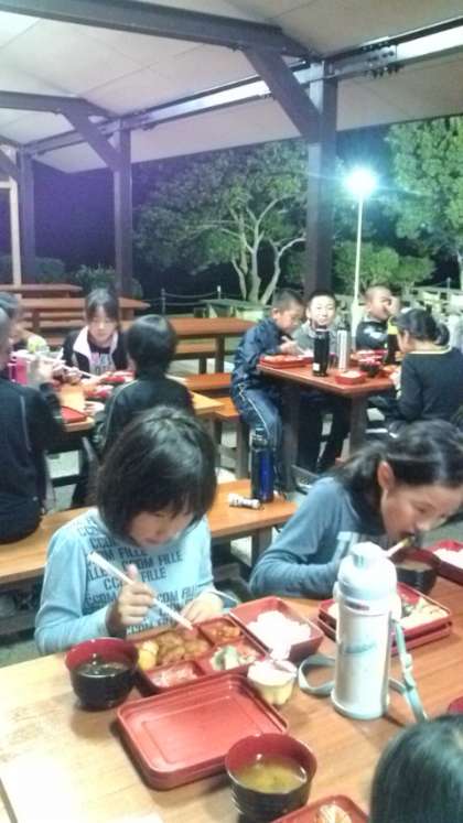 みんなおいしくいただいてます。キャンプファイヤーに向けて、腹ごしらえです!