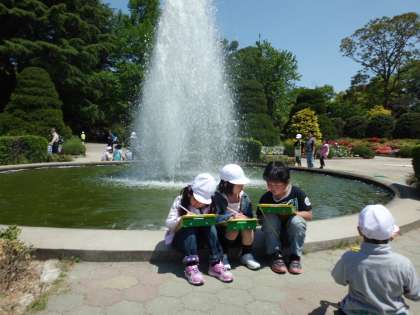 仲良しグループの2年生と一緒に,ばら園や噴水などを巡り,春の植物をたくさん見つけ,お気に入りの花や木をかきました。