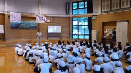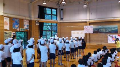 おはようございます。みさきの家は快晴です。今日、最初の活動は、大枝小学校との朝の集いです。校歌をお互いに歌って紹介したり、学校紹介したりしました。