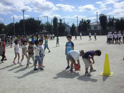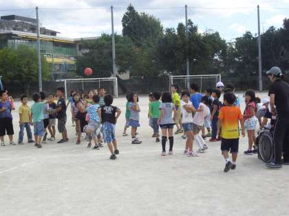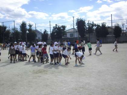10月というのに,昼間は夏のような暑さを感じますが,子どもたちは,休み時間には元気いっぱい運動場で遊んでいます。中間休みには自由に遊んだ後,クラスみんなでいろいろな運動をしています。10月の金曜日は『ボール送り』です。
