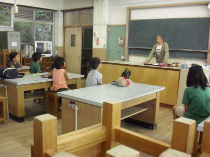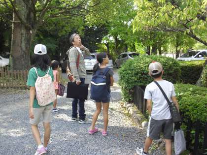 土曜学習の1つとして行っています。,今回は「自然学習〜わたしの木〜」というテーマです。校内にある桜の木,梅の木,柿の木・・・を見てまわり,春から夏,秋から冬へと1年間の変化を観察しています。植物や生き物に詳しい地域のボランティアの方から楽しい話や専門的な話も聞けます。