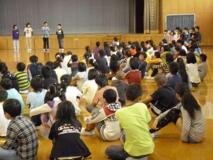 10月のオムロワールドでは,5.6年生の新しい各委員会のメンバーが,これからしていきたい活動をみんなに伝えました。