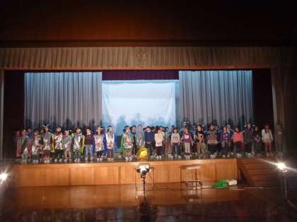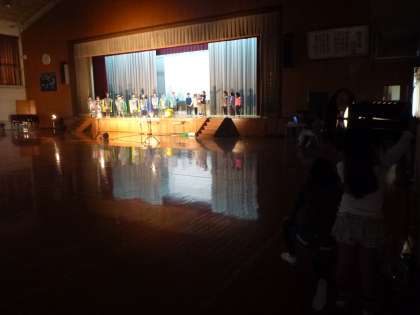 学習発表会の練習ですが,体育館に照明が設置されて,いよいよ雰囲気が出てきました。左右のスポットライトと,舞台下の3本のフットライトで,子ども達の表情や動作がはっきりと見えるようになりました。