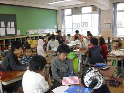 6年生の2つの組が,各々の2グループに分かれて,1年生の2つの組の各々の2グループの低学年に読み聞かせをします。6年の教室でするグループ,1年の教室でするグループに分かれて,ゆったりとしたスペースで読み聞かせをしています。