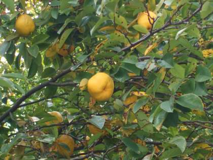 梨ほどの大きな実が黄色く熟し、風に揺られて地面に落ちてきます。