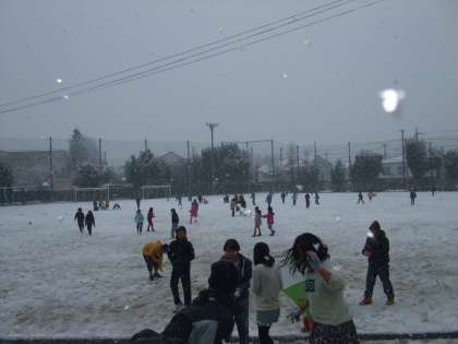 2月14日 天気予報の通り、登校するころから雪が降り始め、みるみるうちに校庭は真っ白になりました。海抜63mの御室校は市内でも積雪量が多い方かもしれません。中間休みの運動場は元気な子どもたちで大賑わいです。靴下がぬれても、ズボンがぬれてもへっちゃら。風邪の心配もどこ吹く風・・・。