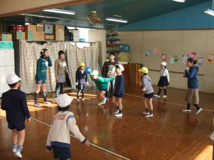 はじめは緊張していた子ども達も,徐々に自分たちから声をかけて楽しく遊んでいました。はじめの会,終わりの会でもそれぞれしっかり話すことができていました。あっという間に時間が過ぎてしまい,「楽しかった!」という園児のつぶやきも聞けました。「また,来て下さい!!」と言われながらお別れしました。