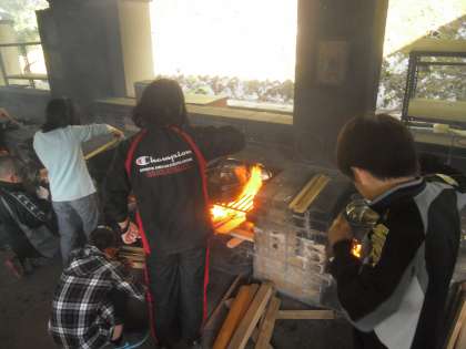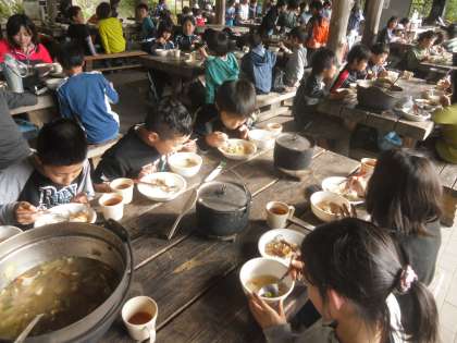 野外炊事をしました。ご飯を炊いて、鶏すき焼き風煮を作りました。