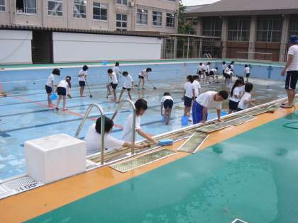 今日は,昨日までの暑さが少し和らぎ,過ごしやすい気温でした。1・2校時に6年生とチャレンジ体験で本校にきている双ケ丘中学校の生徒4人が,一生懸命にプールの中や周りをきれいに掃除しました。