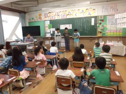 6月5日の朝の会の時間に,図書委員会の子どもたちが1・2年生のクラスとさくらんぼ学級に本の読み聞かせにいきました。