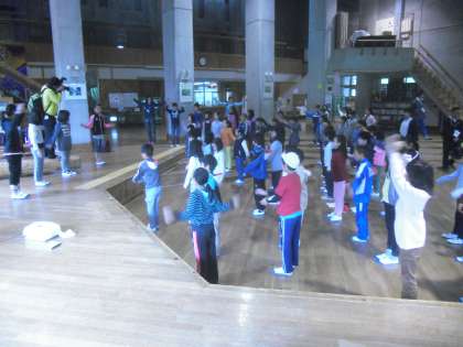 合同の朝の集いが終わって、それぞれの学校に分かれて、朝の集いをしました。体操などをしました。