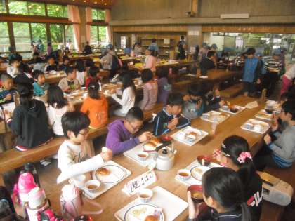 朝の集いの後は、朝食です。今日の朝食も、食堂でバイキングです。ご飯かパンかを選びます。スープとみそ汁も選びます。好きなおかずをお皿にのせます。みんな楽しそうです。