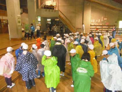 いよいよ天狗杉登山に、出発です。オリエンテーションホールで説明を聞いて、山の家から出発しました。降っているか降っていないかわからないような霧雨の中、カッパを着て、出発しました。