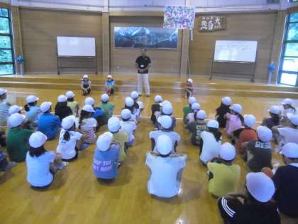 お弁当を食べたら、90畳の部屋に入り、荷物を置いて、プレイホールで、入所式を行いました。そのあと、オリエンテーションで、いろいろ説明を受けました。