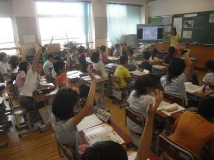 9月2日4時間目5年1組は,総合的な学習の時間の1つ,英語活動をしました。「How many 〜 ?」で,いくつあるかの質問や答えをしました。