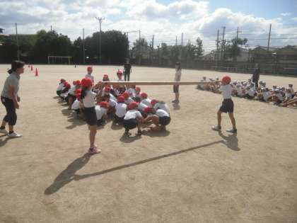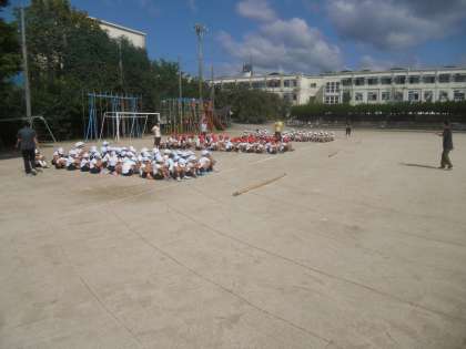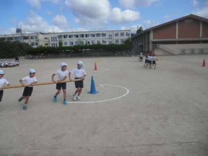 9月11日(金)1時間目,3・4年さくらんぼ学級で,合同体育の学習をしました。運動場で,「団体競技 オムロ大旋風」の練習をしました。まずは,やり方やルールを習いました。