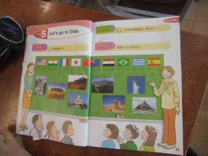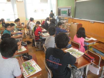 9月15日(火)1時間目,6年2組,教育実習生の英語活動です。テレビの発音や実習の先生の発音を聞きながら,学習します。