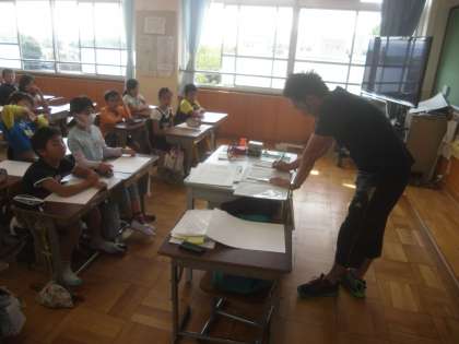 4年1組の朝の健康観察の様子です。子どもたちに,健康状態を担任の先生が聞いて,メモをして,養護教諭に伝えます。