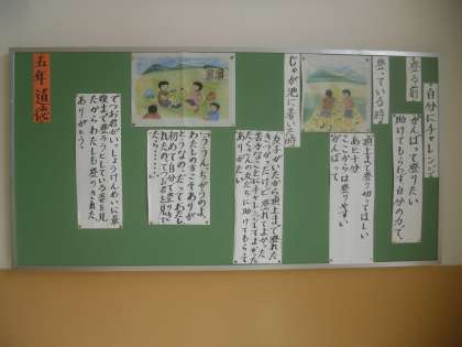 5年生の階段掲示は,道徳で学習した「自分にチャレンジ」という板書の掲示です。これを見て,授業を思い出したり,違う考えを思いついたりしてくれるとうれしいです。