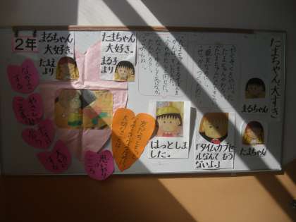 2年の階段掲示です。道徳の授業で学習した「たまちゃん大すき」の掲示をしています。道徳の授業を思い出したり,考え直したりしてほしいです。