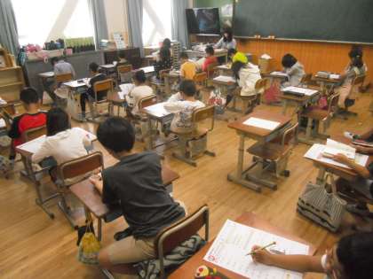 10月8日(木)1時間目3年2組は算数の学習をしました。今日は,テストです。「あまりのあるわり算」のテストをしました。テストの時は,席を離して,いつもと違う並び方でテストをします。