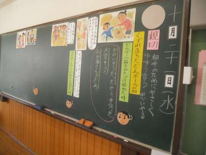 10月21日〈水)5時間目5年2組で,道徳の授業がありました。研究授業ということで,校内の全員の先生と指導助言の先生に見に来てもらっての授業でした。子どもたちも頑張り,とても良い授業でした。授業後の余韻の時間には,道徳独特の良い雰囲気がありました。「くずれ落ちた だんボール箱」という題材でした。
