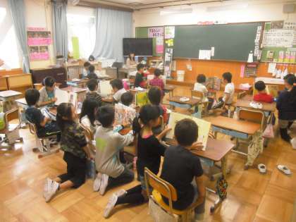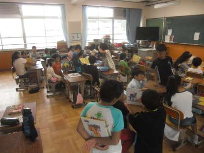 10月22日〈木)朝読書の時間に,兄弟クラス読み聞かせがありました。6−1は1−1へ,6−2は1−2へ,5−1は3−1へ,5−2は3−2へ,4−1は2−1へ,4−2は2−2へ,さくらんぼ学級は交流学級へ,行って,上の学年の児童が,下の学年の児童に,読み聞かせをしました。どんな本がいいか,選んで,聞きやすいように工夫して読みました。