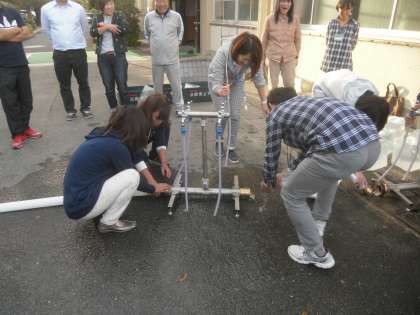 10月27日〈火)午後4時から,教職員が,上下水道局の方を講師に招いて,仮設水栓設置訓練をしました。学校が避難所になった時に,理科準備室においてある道具を使って,給水車や消火栓から水を引いて,簡易水道を作る訓練でした。